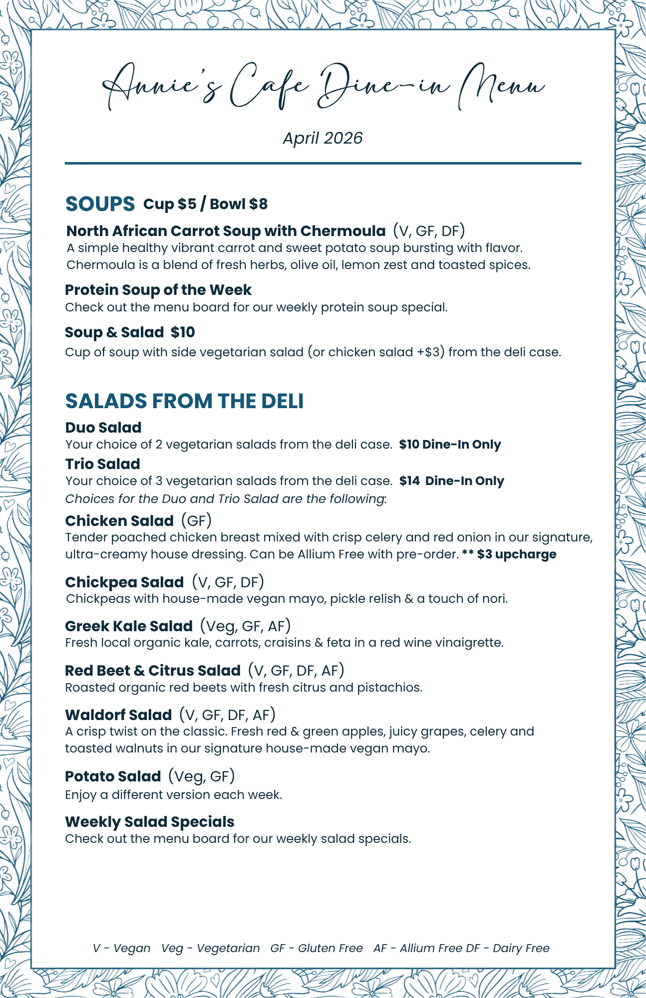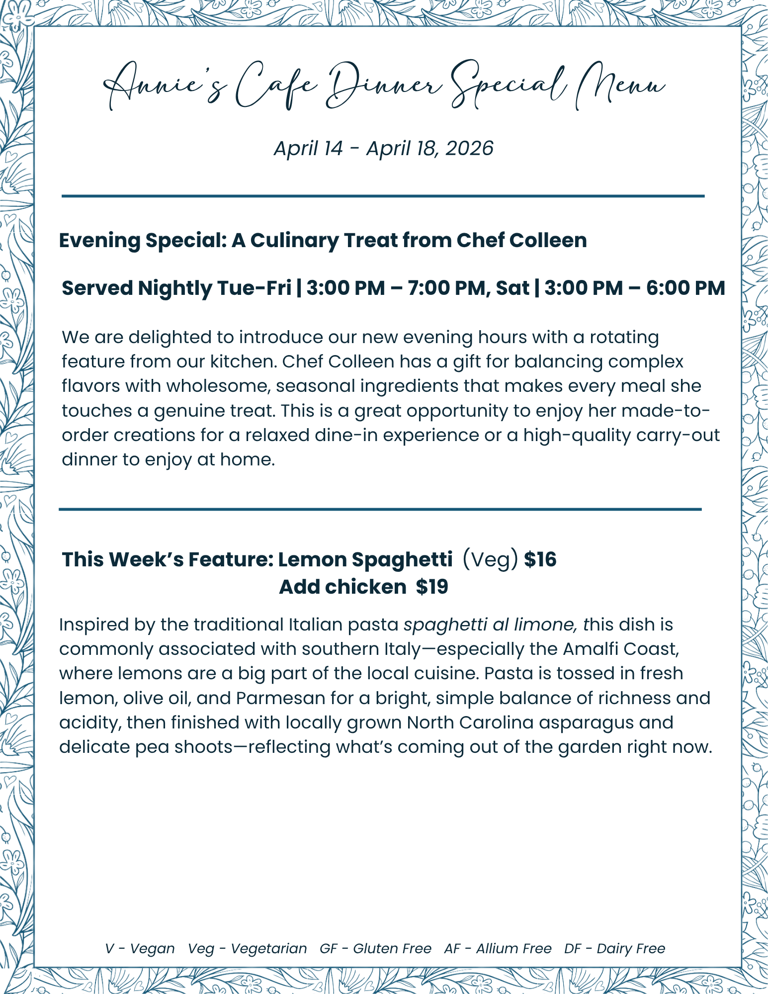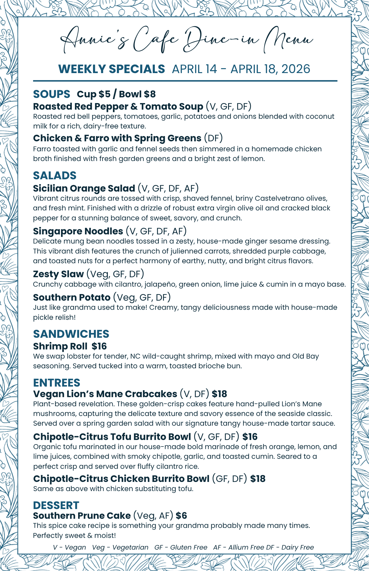 Annie’s Menu 4/14/26 thru 4/18/26
